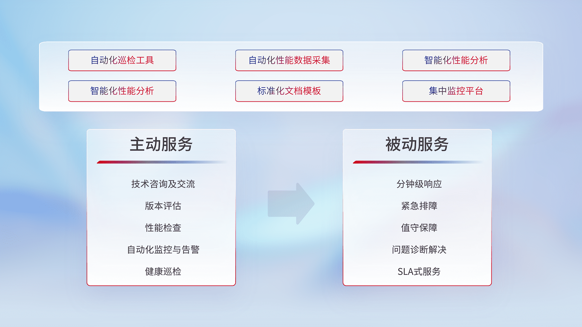 智能化工具和标准化文档,,,,保障服务质量,,提供主动服务(包含技术咨询、、、版本评估、、性能检查、、、、自动化监控与告警、、健康巡检)和被动服务包含(分钟级响应、、、紧急排障、、值守保障、、问题诊断解决、、、SLA服务)。。。